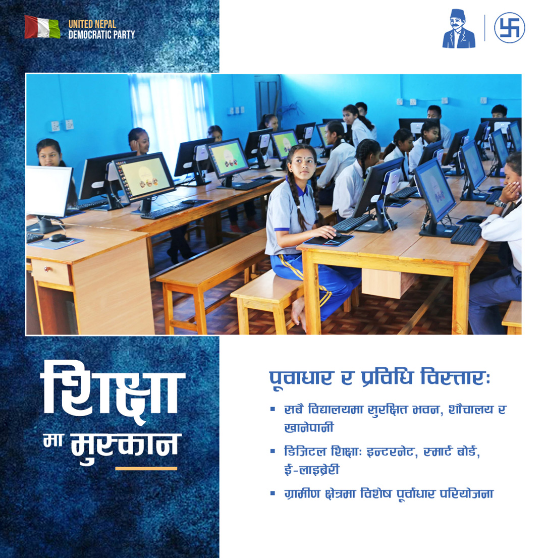 त्यसैगरी, डिजिटल शिक्षाको विस्तार आजको आवश्यकता हो। विद्यालयमा इन्टरनेट सेवा, स्मार्ट बोर्ड र ई–लाइब्रेरी उपलब्ध गराइएमा विद्यार्थी आधुनिक ज्ञान र प्रविधिसँग परिचित हुन्छन्। ग्रामीण क्षेत्रमा विशेष पूर्वाधार परियोजना सञ्चालन गरी विद्यालय–विद्यालयमा प्रविधि र भौतिक संरचना सुदृढ बनाउँदा शहरी र ग्रामीण शिक्षाबीचको अन्तर घट्दै समान गुणस्तरीय शिक्षा सुनिश्चित गर्न सकिन्छ।