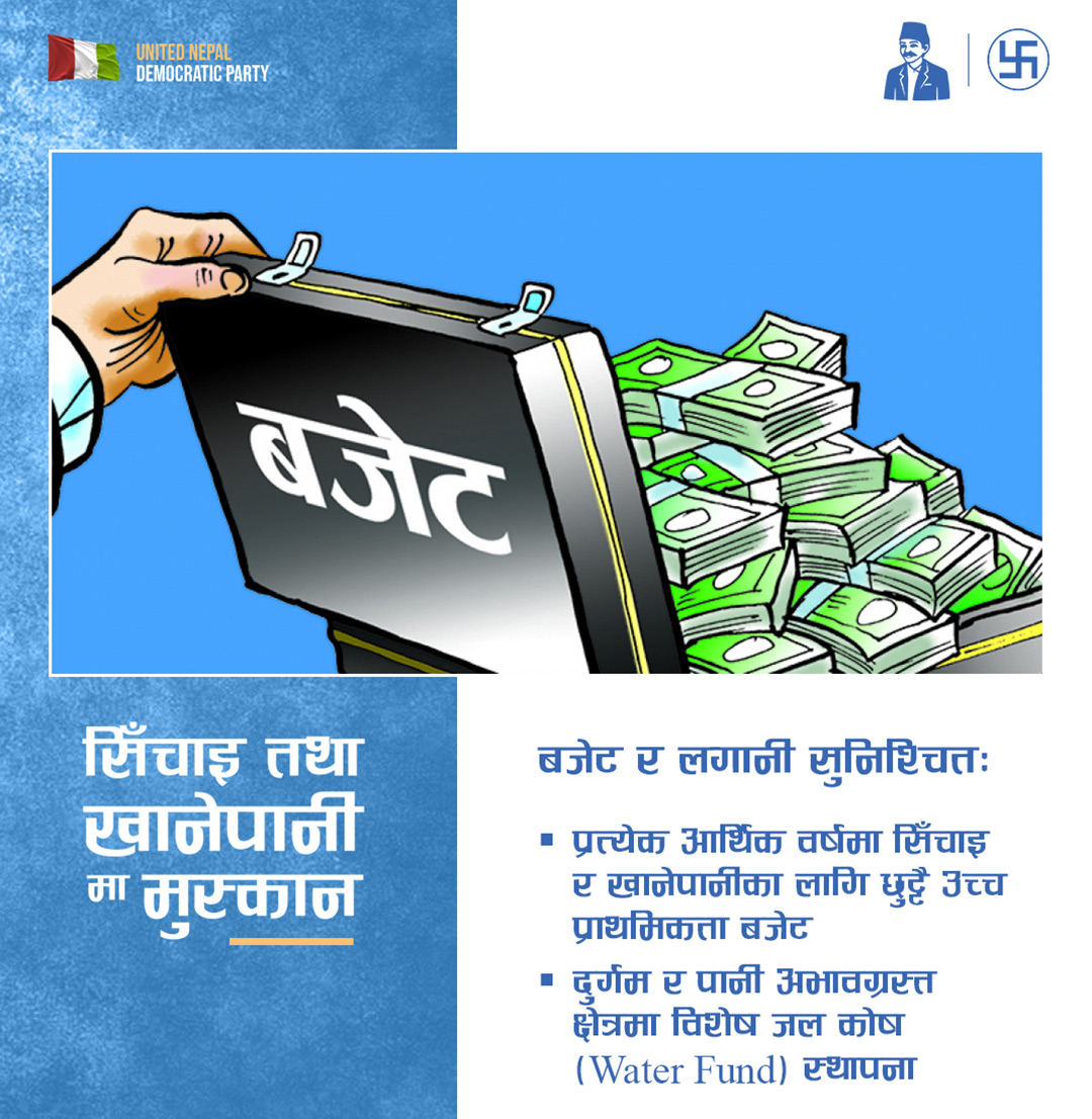 बजेट र लगानी सुनिश्चित नगरी सिँचाइ तथा खानेपानीका कार्यक्रमहरू प्रभावकारी रूपमा अघि बढ्न सक्दैनन्। त्यसैले प्रत्येक आर्थिक वर्षमा सिँचाइ र खानेपानी क्षेत्रका लागि छुट्टै र उच्च प्राथमिकतासहित बजेट विनियोजन गर्नु आवश्यक छ। दीर्घकालीन योजना अनुसार पर्याप्त बजेट सुनिश्चित गरिँदा अधुरा आयोजना सम्पन्न हुने, नयाँ परियोजना समयमै सुरु हुने र कृषिमा उत्पादकत्व वृद्धि भई नागरिकको जीवनस्तर सुधार हुने आधार तयार हुन्छ।