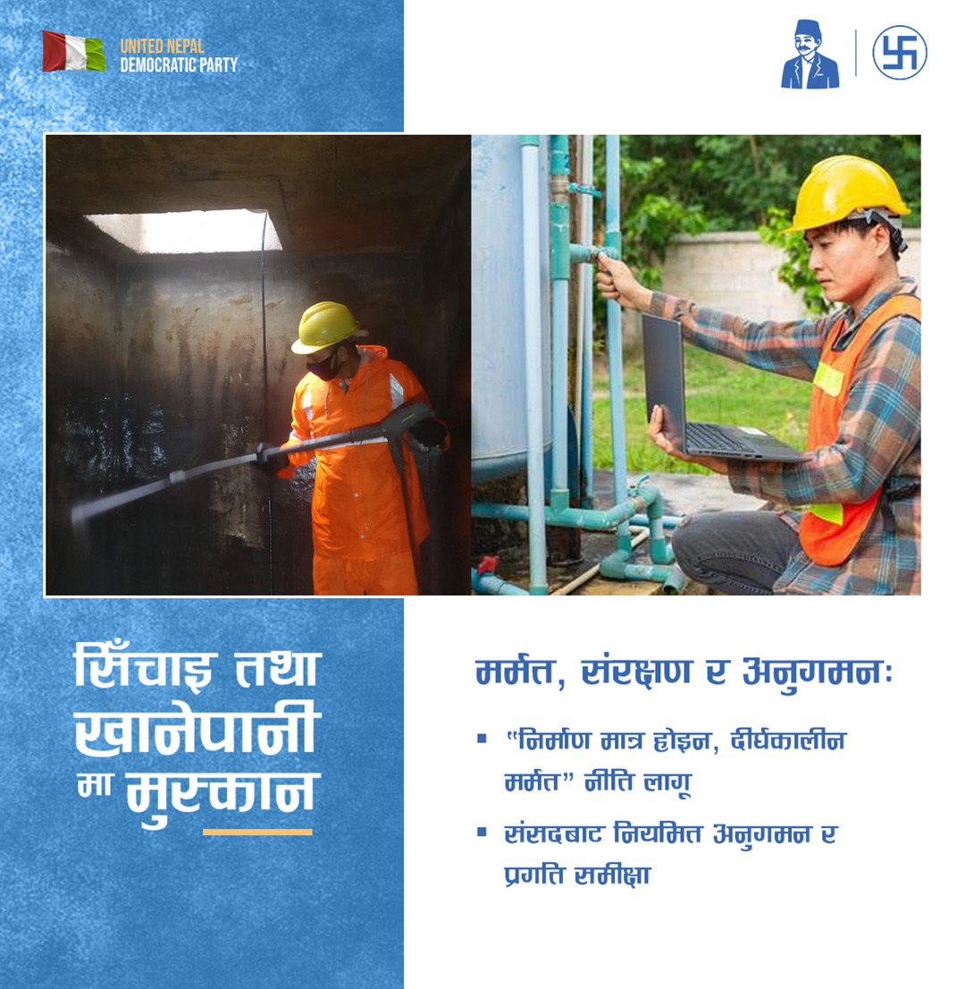 मर्मत, संरक्षण र अनुगमन दिगो पूर्वाधार विकासका अनिवार्य आधार हुन्। “निर्माण मात्र होइन, दीर्घकालीन मर्मत” भन्ने नीतिलाई कडाइका साथ लागू गर्दा एक पटक बनेका खानेपानी तथा सिँचाइ आयोजना दीर्घकालसम्म प्रभावकारी रूपमा सञ्चालन हुन सक्छन्। नियमित मर्मतसम्भार, समयमै संरचना सुदृढीकरण र स्रोत संरक्षणमा ध्यान दिँदा आयोजना बिग्रिने, बन्द हुने वा पुनः ठूलो लागत लाग्ने समस्याबाट जोगिन सकिन्छ।