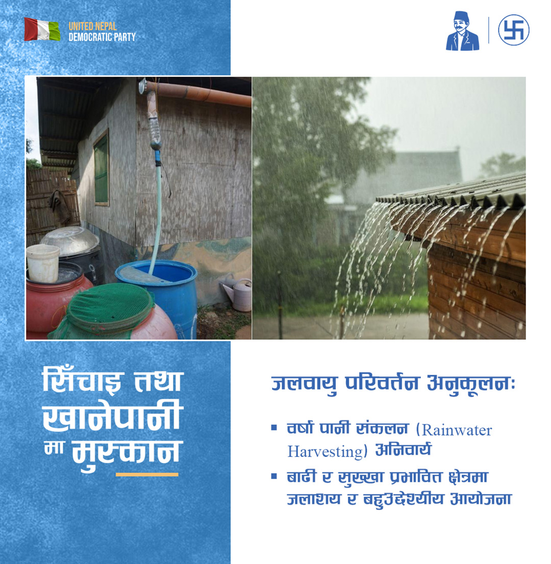 जलवायु परिवर्तन अनुकूलन आजको सबैभन्दा महत्वपूर्ण आवश्यकता हो, विशेष गरी पानी स्रोतसँग प्रत्यक्ष सम्बन्धित क्षेत्रमा। अनियमित वर्षा, लामो खडेरी र अत्यधिक वर्षाका कारण उत्पन्न समस्या समाधान गर्न वर्षा पानी संकलन (Rainwater Harvesting) लाई अनिवार्य बनाउनु अत्यन्त प्रभावकारी उपाय हो। घर, विद्यालय, सार्वजनिक भवन र संस्थागत संरचनामा वर्षा पानी संकलन प्रणाली जडान गर्दा पानीको अभाव घट्ने, भू–जल पुनर्भरण हुने र खानेपानी तथा सिँचाइमा वैकल्पिक स्रोत सुनिश्चित गर्न सकिन्छ।